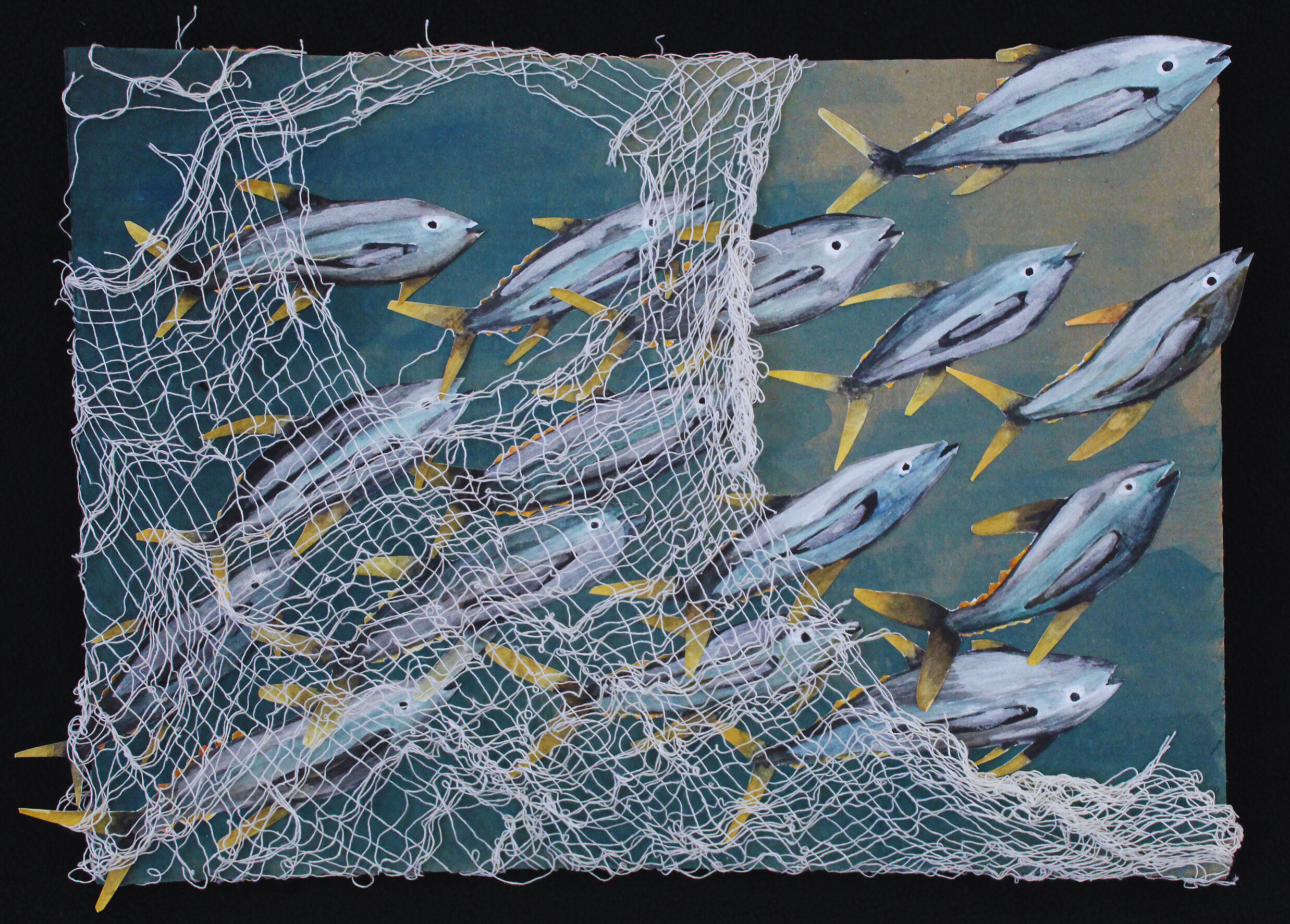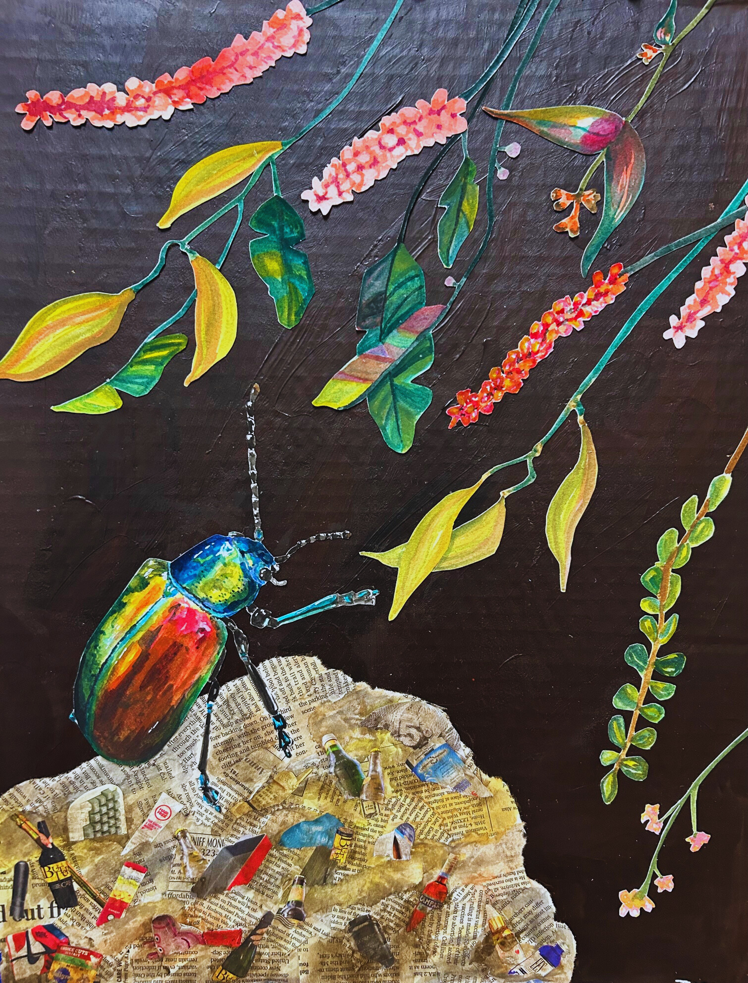 What Goes Around Comes AroundFound trash, colored pencil, watercolor