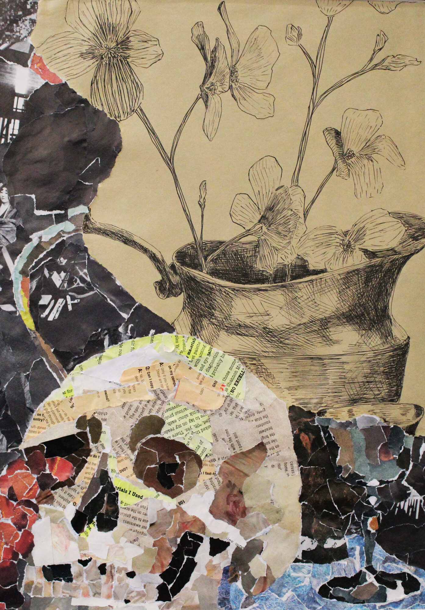 Reaching for RenewalMagazine cutouts, newspaper, watercolor, acrylic paint